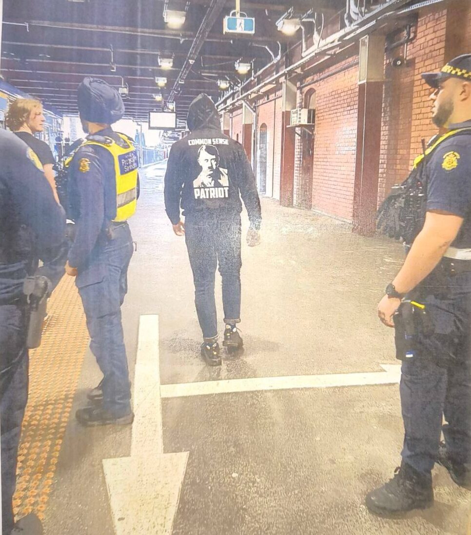 Mr Nelson was allegedly wearing a black T-shirt bearing a black sun symbol, an image of Ned Kelly and the anti-immigration slogan “Fuck off we’re full”, while Mr Bull was allegedly wearing a black hoodie with an image of Adolf Hitler on the back along with the words “common sense patriot” in white capital letters.
