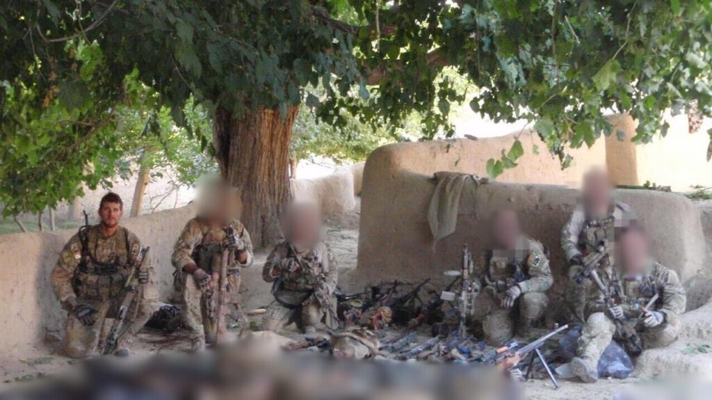 A photo taken after that battle shows Roberts-Smith, who famously wore a crusader patch on his uniform, and five other SASR operators posing behind the bodies of dead Taliban fighters.