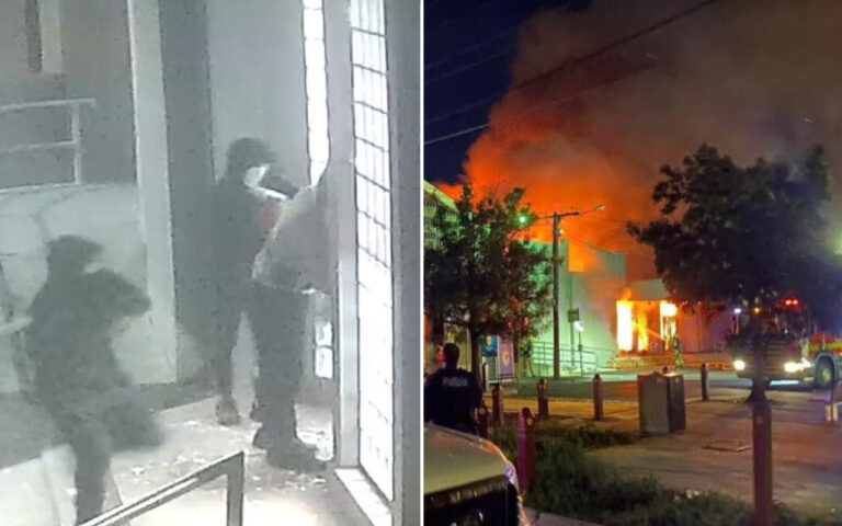 Header image: Left, CCTV of the alleged arsonists (Victoria Police). Right, the synagogue on fire.