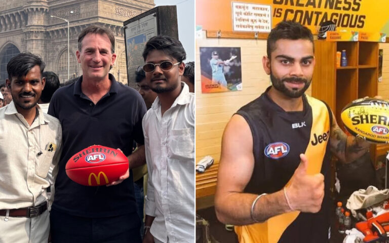 Header image: Left, Mr Dillon in Mumbai (supplied). Right, Indian cricketer Virat Kohli promoting the AFL last year (AFL Desi).