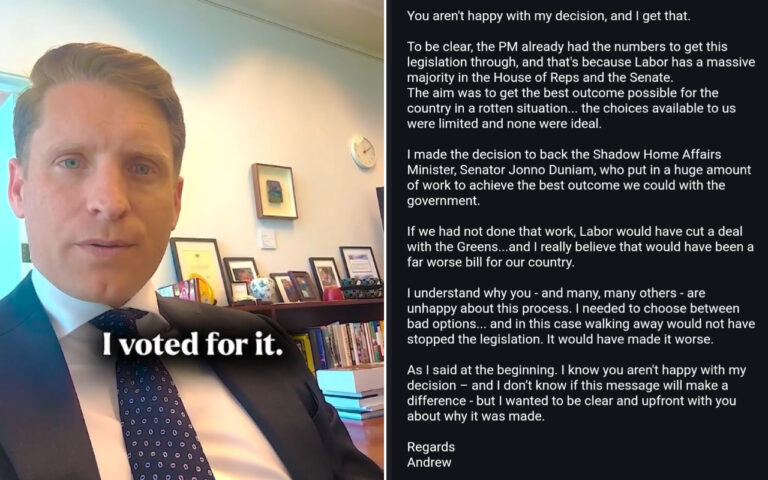 Header image: Left, Andrew Hastie in a video after the vote. Right, the form letter email sent to supporters (X).