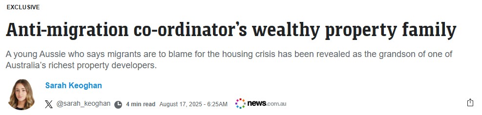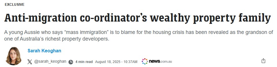 Headline: Anti-migration co-ordinator’s wealthy property family: A young Aussie who says migrants are to blame for the housing crisis has been revealed as the grandson of one of Australia’s richest property developers.