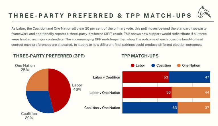 The Fox & Hedgehog survey from January 5 and 6 also had One Nation as the third largest party on 21% of the primary vote, behind to Coalition on 25% and Labor on 29%.