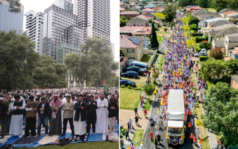 Header image: Left, Muslims pray in Melbourne’s CBD on Friday (Islamic Council of Victoria). Right, Sikhs hold a parade in Sydney (SBS Punjabi).