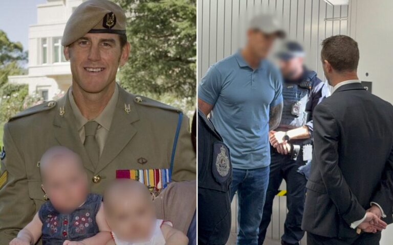 Header image: Left, with his family after winning his Victoria Cross (ADF). Right, Ben Roberts-Smith being arrested (AFP).