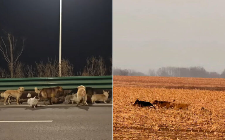 They were tracked by animal rescue volunteers using a drone, and footage posted on Douyin, the Chinese version of TikTok, shows the dogs pressing forward in unison, refusing to scatter despite heavy traffic and exhaustion, while other videos emerged of the pack walking through a wheat field.