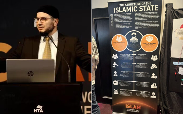 Header image: Left, a speaker at a Hizb ut-Tahrir conference in Sydney last year (YouTube). Right, a sign at the conference (Hizb ut-Tahrir Australia).
