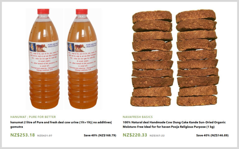 New Zealanders have been left in disbelief after discovering an Indian retailer is selling cow dung and urine for hundreds of dollars.