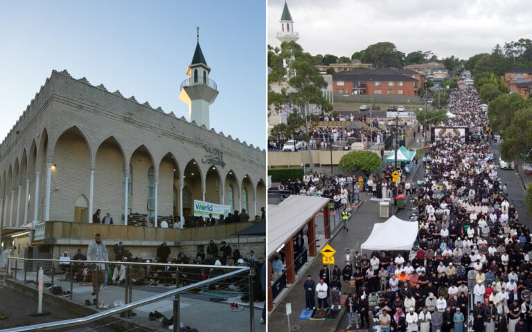 Header image: Left, Lakemba Mosque. Right, Muslims pray in the street outside the mosque (Facebook).