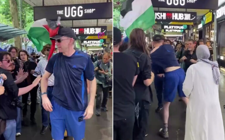 Header image: Left, right, the man being surrounded by leftist protesters (Euan Kennedy – Instagram).