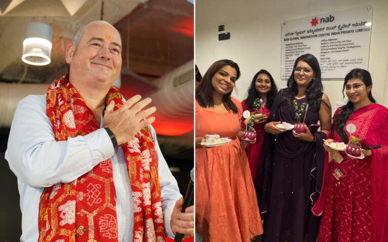 Header image: NAB CEO Andrew Irvine at the India Innovation Centre. Right, workers at NAB India at an International Women’s Day event (LinkedIn).