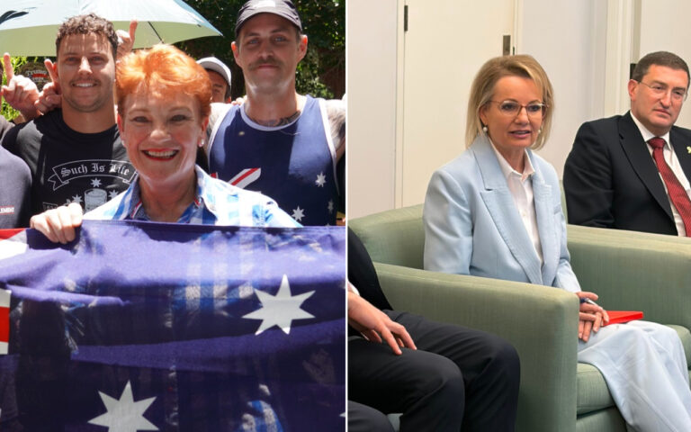 Header image: Left, Pauline Hanson with supporters on Australia Day. Right, Sussan Ley after making her hate speech deal with Labor (Facebook).