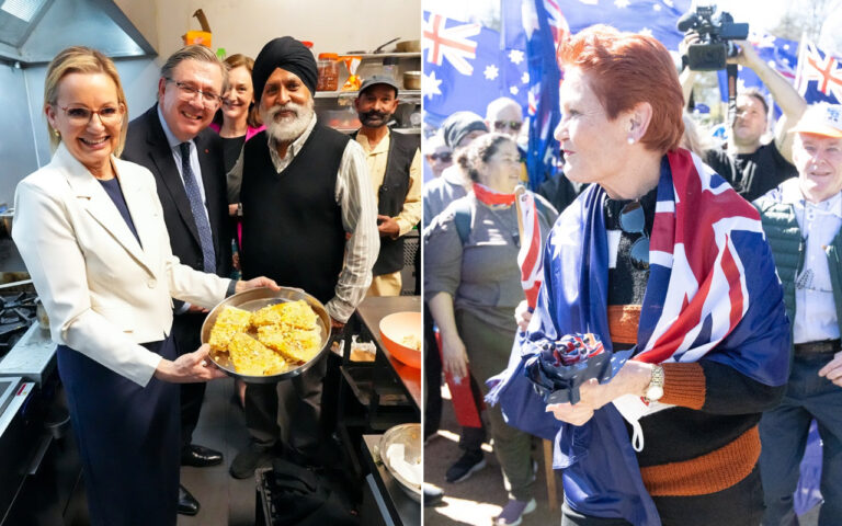 Header image: Left, Sussan Ley pandering to Indian voters. Right, Pauline Hanson at the March for Australia rally in Canberra (Facebook).