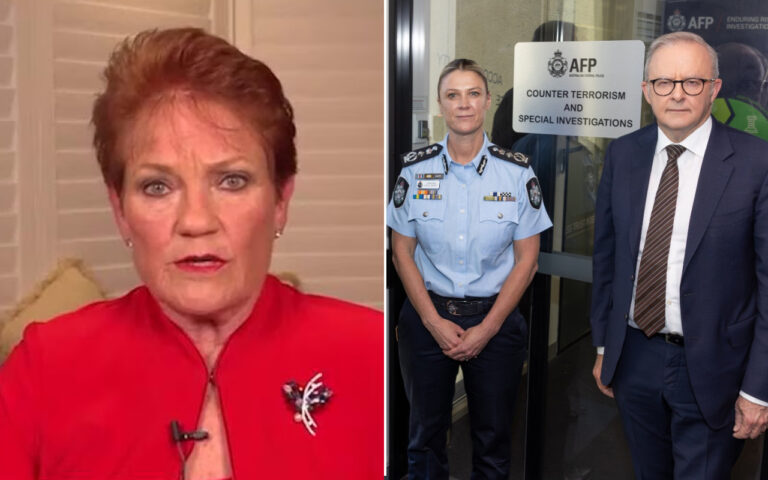 Header image: Left, Pauline Hanson during the interview where she made the comments (Sky News Australia). Right, AFP Commissioner Krissy Barrett and Anthony Albanese (AFP).