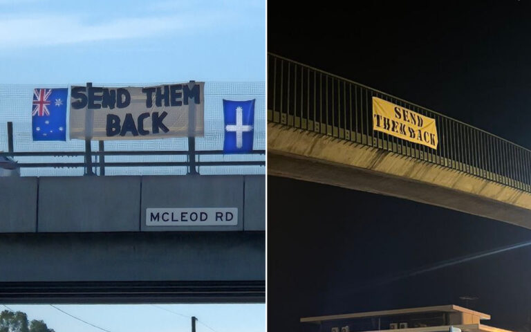 About 60 banners reading “send them back” were attached to bridges and overpasses on Sunday night, some next to Australian and Eureka flags, sparking an outpouring of support on social media the following morning.
