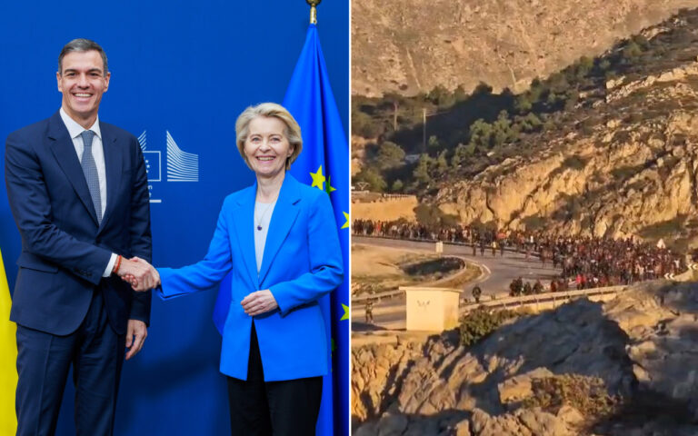 Header image: Left, Pedro Sanchez with President of the European Commission Ursula von der Leyen (Facebook). Right, hordes of illegals approach the Spanish enclave on Ceuta on the Moroccan border in 2023.