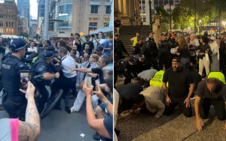 A video filmed outside Town Hall showed police punching a man in a white business shirt after he grappled with an officer on a bicycle, while in a separate clip police could be seen forcing Muslim men who were praying on the footpath to move on.