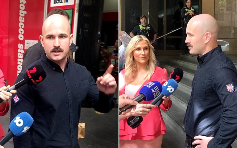 White Australia leader Thomas Sewell speaks to the media outside court today – asks why the same magistrate who refused him bail for 72 days didn’t jail a “transgender” far-left extremist who set off a bomb at a Melbourne expo.