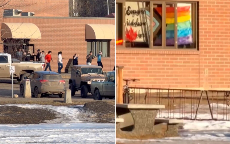Header image: Left, students coming out of the school after the shooting. Right, a “pride” flag in a school window (Western Standard).