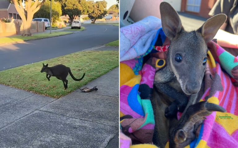 A wallaby joey has fallen out of her mother’s pouch in front of a shocked Australian woman who immediately called wildlife rescue and saved the baby marsupial’s life.