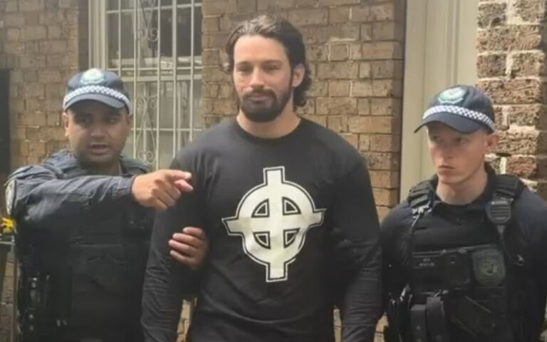 Header image: Brandan Koschel is arrested after breaching new NSW “hate speech” laws on Australia Day. He has since been jailed for one year (supplied).
