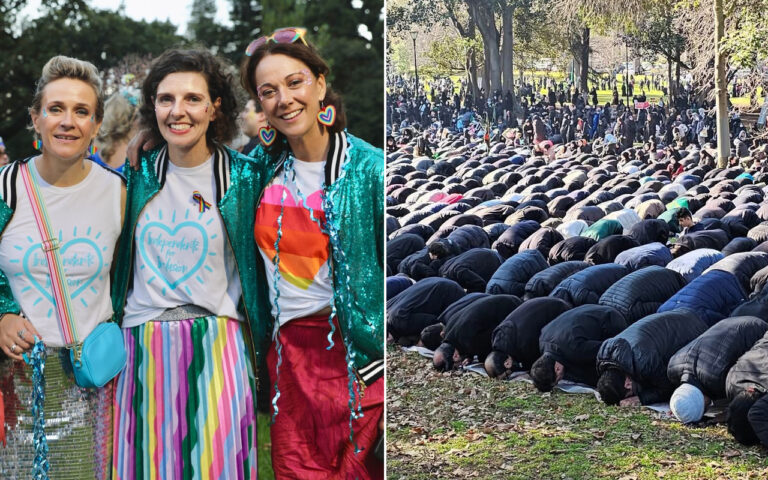 Header image: Left, Ms Steggal, Ms Spender and Dr Scamps. Right, Muslims praying in a park in Melbourne (Facebook).